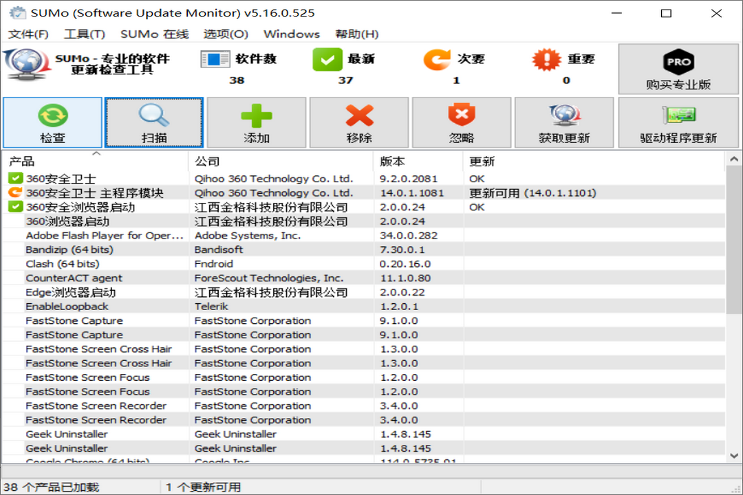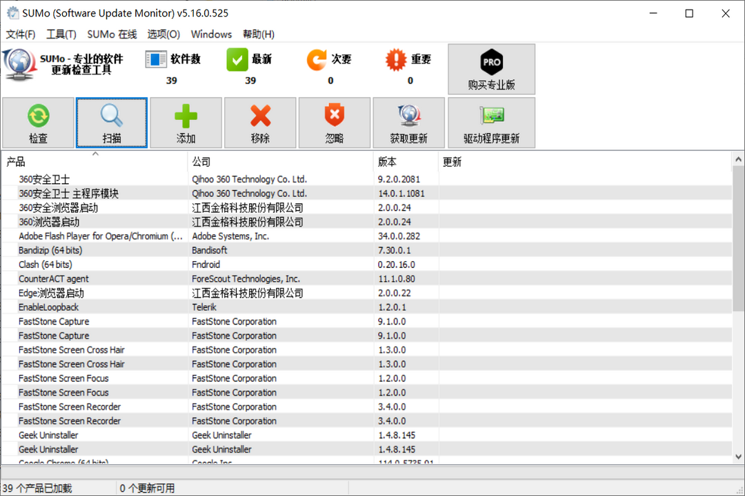 SUMo是一款专注于电脑软件的更新工具,SUMo最新版将会和在线联网的软件库之中软件版本相互匹配,以此来确定用户的设备之中的软件是否需要更新,以此来提醒用户将设备更新到最新状态,并且还可以直接选择后台更新,无需手动处理。