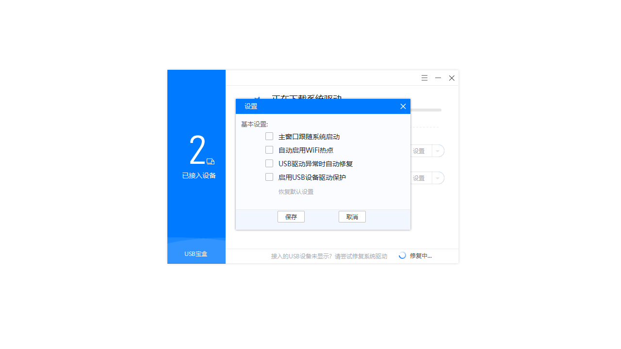 USB宝盒之中可以检测整个电脑的驱动状态,如果有需要更新或者是缺失的会显示出来,驱动缺失之后电脑会有着部分功能异常无法显示出来,并且整体却可以正常运行,这就需要该软件来帮助用户更新驱动了。