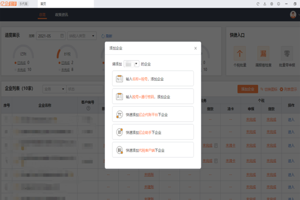 便捷批量处理:支持多企业批量零申报,对于简单的企业财税业务,能够进行极速处理,也能实现个税批量申报,单户企业还可一键完成增值税、企业所得税、附加税等全税种批量报送。