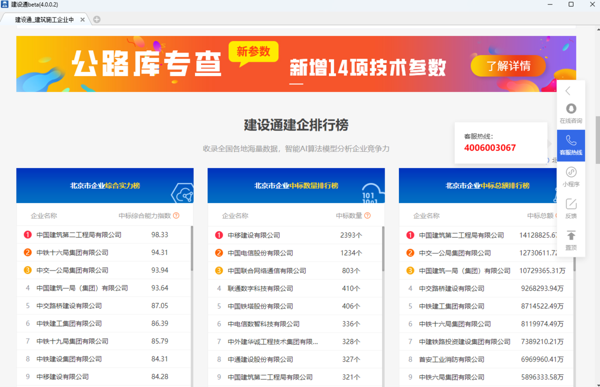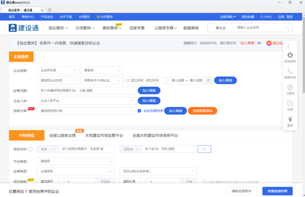 查业绩:包括全国中标公示公告、四库一平台业绩、各市项目库业绩、施工 / 勘察设计业绩、查相似业绩、项目经理业绩、业绩来源、官网中标截图等,可核实业绩真假、管理本企业绩。