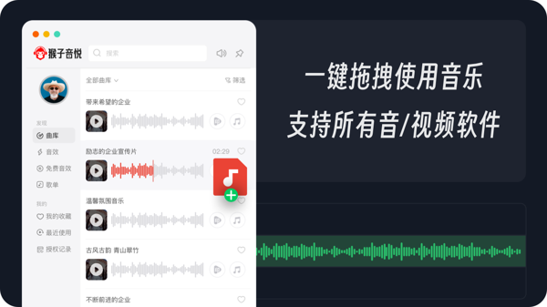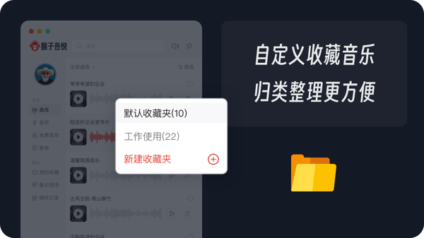 猴子音悦专注于打造版权音乐曲库,拥有超过 30 万首高品质音乐,风格类型极为丰富。