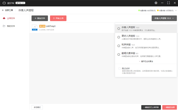 一键将歌曲中的人声和伴奏精准分离,提取出的伴奏质量高,可用于翻唱、remix或制作串烧,提取出的人声干净清晰。
