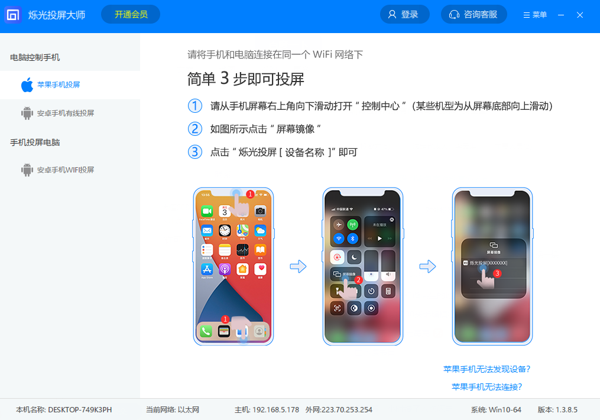 烁光投屏大师软件是一款全面智能的投屏软件,烁光投屏大师电脑版支持多种操作系统和设备,兼容性广,用户能够无障碍地在不同设备之间进行投屏和共享,可以轻松实现手机与电脑、平板之间的文件共享与传输,省去了传统数据线传输的麻烦。