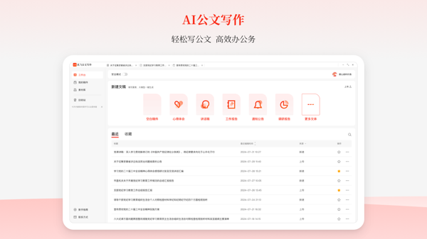 讯飞公文写作app是一款专注于公文写作的智能辅助工具,讯飞公文写作电脑版能够提高用户在撰写公文时的效率和质量,提供多种公文格式模板,自动按照标准规格规范排版,能够让公文格式符合相关标准,帮助用户快速完成写作任务。