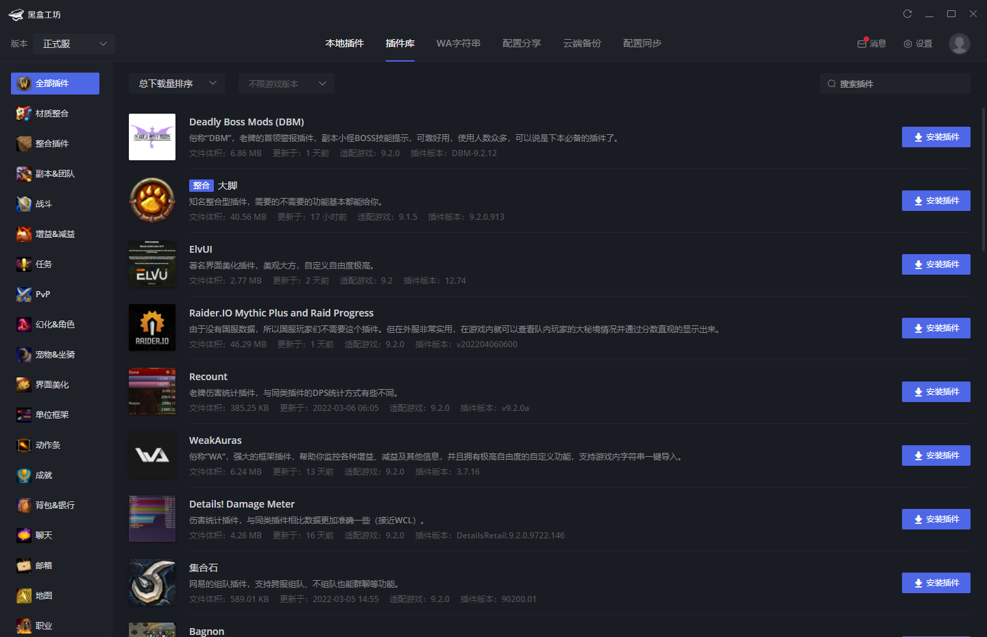 海量插件库,涵盖 UI、战斗、生活等各类插件,正式服与怀旧服玩家均可按需一键安装,丰富游戏体验。