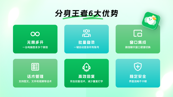 分身王者电脑版是一款功能全面的应用多开软件,分身王者PC客户端能够帮助用户轻松管理多个账号信息,其中内置了超多功能供用户使用,可以将常用的回复、资料集中存放,点击即可自动发送,企业能够减少重复的打字工作,帮助客服人员在短时间内处理更多客户咨询。