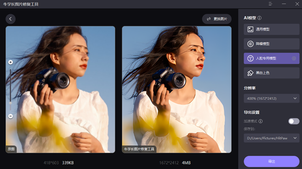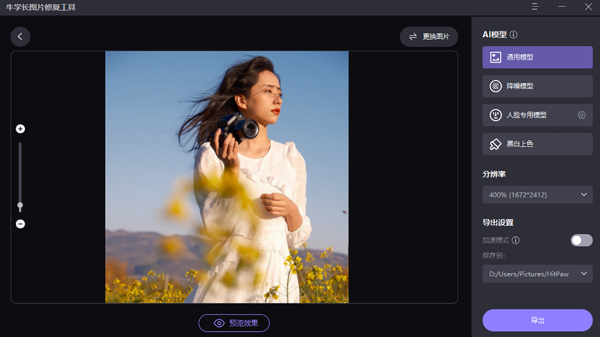 牛学长图片修复工具软件提升图片的清晰度和细节表现,提升模糊的照片或低分辨率的图像,让图片看起来更加的清晰。