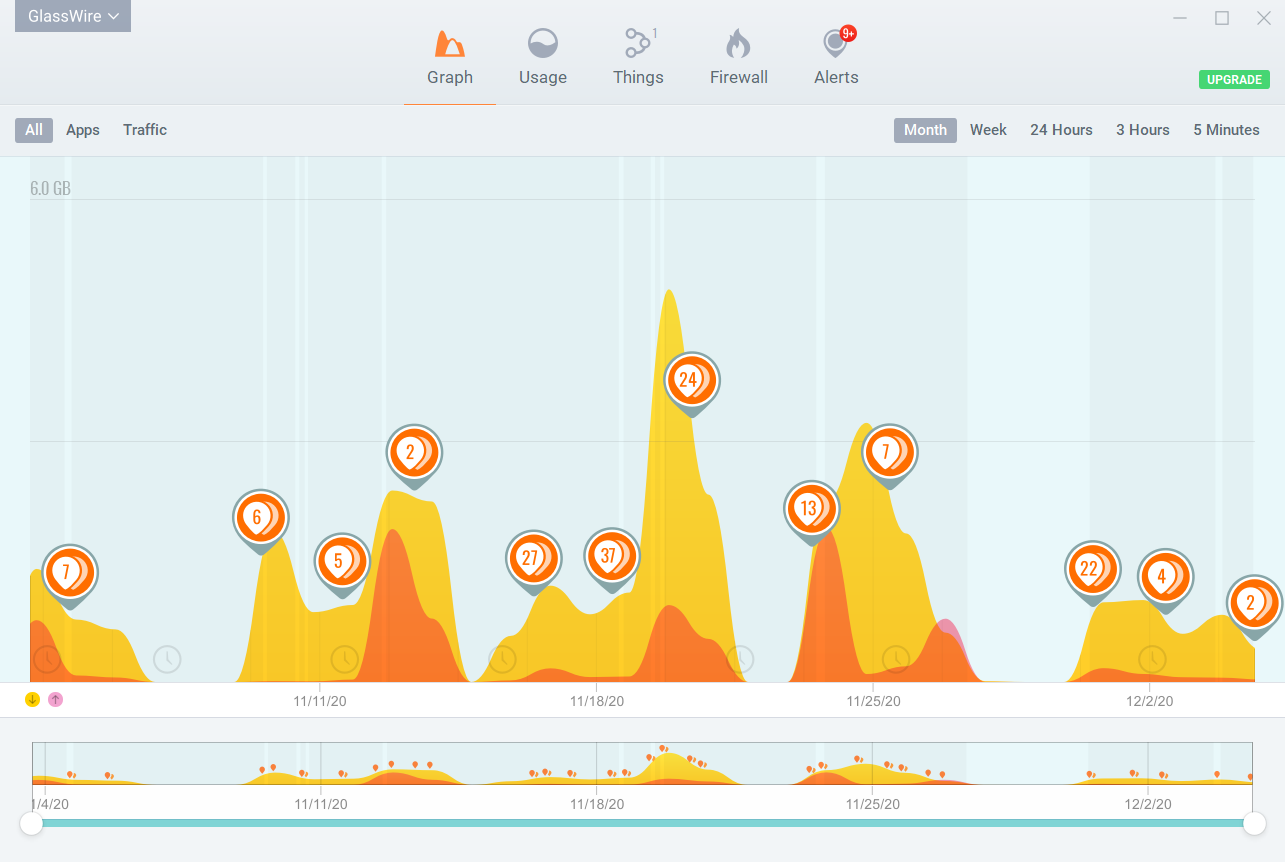 GlassWire是一款好用的流量统计软件,GlassWire中文版帮助用户可以直接在电脑之中查看使用的流量,该软件以图标的形式表现实时的流量数据,也可以直接统计一段时间或者一天等等区域的时间,基本可以让用户一眼就看出流量的使用情况。