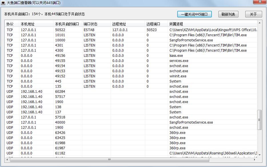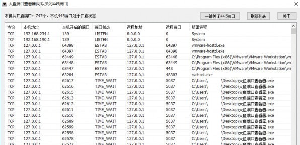 大鱼端口查看器可以直接查看设备的445端口,该端口的主要作用点就是在网络上帮助设备与系统进行文件交流的数据交换,并且该软件可以直接显示出用户的协议、本机地址、本机开启的端口。