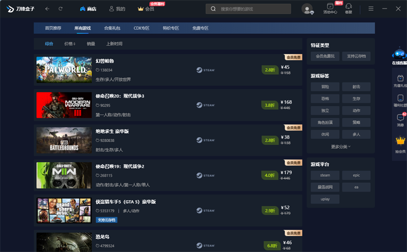 刀锋盒子是一款非常好用的游戏平台软件,刀锋盒子电脑版之中用户可以使用该软件来浏览整个steam平台之中的游戏打折情况,该软件可以帮助用户直接购买这些游戏,还有大型3D游戏直接在打折的基础上进一步平台优惠功能,让用户可以一省再省。