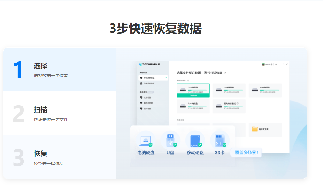 可轻松应对误删、回收站清空、磁盘格式化、分区丢失、重装系统等多种数据丢失场景,同时支持 SD 卡、存储卡、U 盘等外接设备的数据找回。