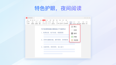 PDF 阅读器界面贴近原生 office,提供多种阅读模式,其中护眼模式能有效缓解眼疲劳,适配不同阅读场景。
