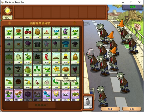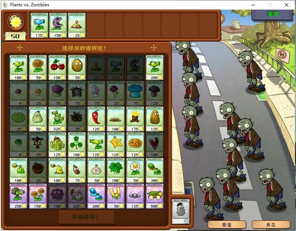 游戏中有 49 种功能强大、互不相同的植物,如豌豆射手可远距离攻击,食人花能吃掉靠近的僵尸,樱桃炸弹可与周围僵尸同归于尽等。