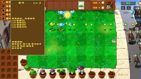 在原版基础上加入了更多的植物和僵尸,每种都有独特的技能和属性,例如阳光菇子弹经过时有一定概率会转化为阳光。