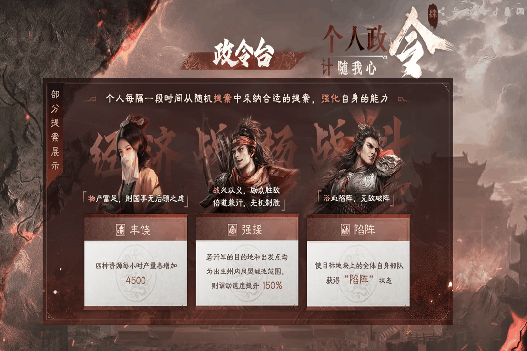 玩家与盟友合作建设城池,各自分工,共享城池升级带来的资源与属性加成奖励。