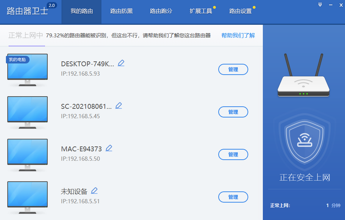 路由器卫士是一款非常强大的安全防护软件,路由器卫士电脑版之中用户可以利用该软件来保护路由器的安全以及漏洞修复,可以直接查看网络的连接设备,并且会显示每个设备的IP地址、MAC地址和设备类型,帮助用户踢掉那些陌生蹭网的设备,让你的网络可以快速又好用。