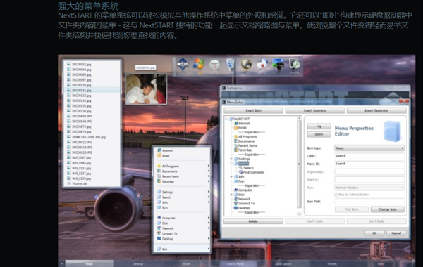 NextSTART 模块可替代 Windows 开始菜单和任务栏,包含开始按钮、快速启动区、任务列表区等多个部分,功能比系统内置任务栏更丰富。